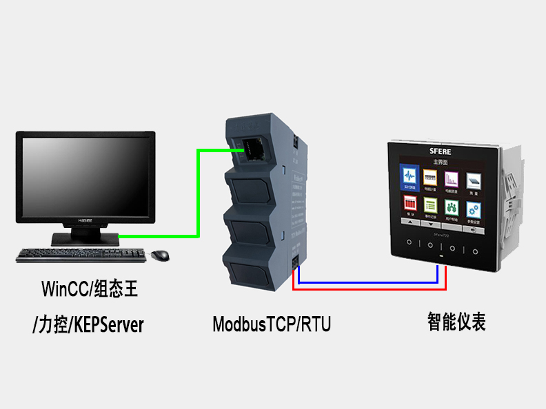 通過ModbusTCP/ModbusRTU,可將帶有ModbusRTU協議(RS485)通訊的設備,如:智能儀表、PLC、變頻器等直接與上位機通訊。
